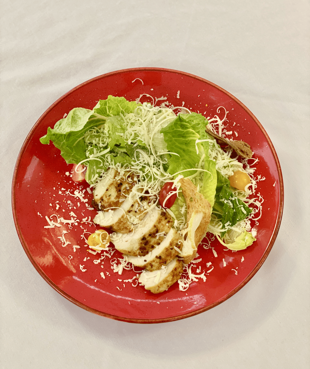 Листья салатов айсберг и романо с соусом цезарь, куриным филе, пармезаном и хлебными чипсами
