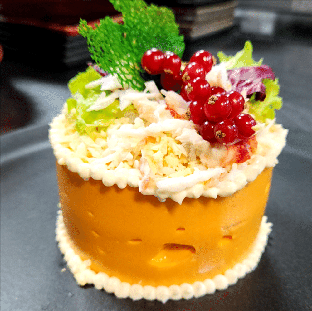 Слои семги и краба с картофелем, морковью и майонезом в морковном муссе и яичной стружке