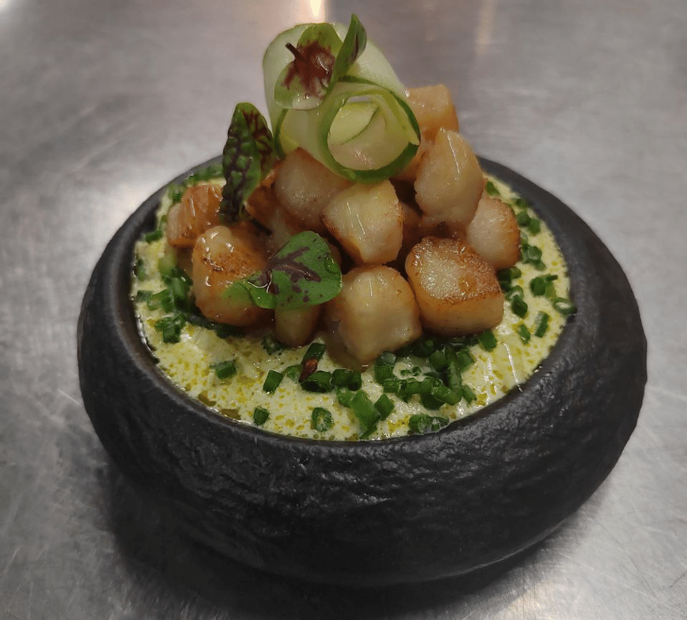 Жаренный морской гребешок с картофельным пбре и базиликовым маслом